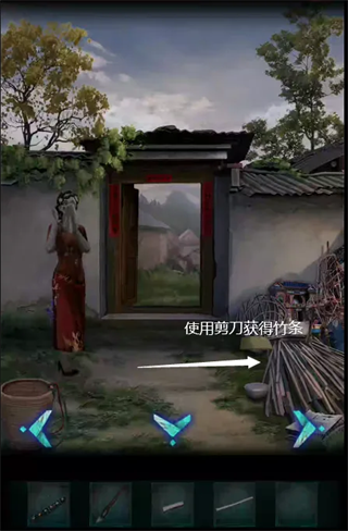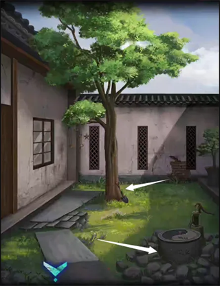 8、使用青铜钥匙打开厨房的门,进入后院。点击右边水井,获得铁架,在大树下获得铁铲。