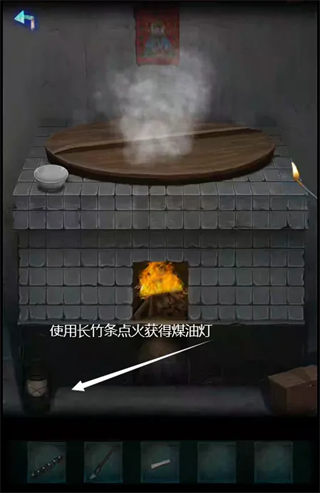 使用长竹条在厨房的灶台处取火,点燃煤油灯。