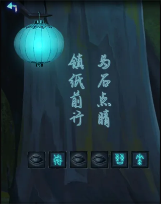 13、点击灯笼串最底下那个,获得白灯笼,将白灯笼挂在左边的墓碑上,可看见上面的字和密码锁,根据文字为石点睛可知需要根据石碑上白点的提示点击与其相对应的字,六个墓碑中有三个是纸墓碑,不需要考虑,只需要考虑石碑白点与灯笼对应的文字即可。