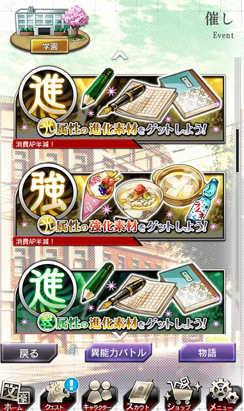 掉落物与EP可以兑换物品,其中包括恢复体力的饮料及升级素材和用于进化的素材还有活动特别卡牌(一般都是SR)