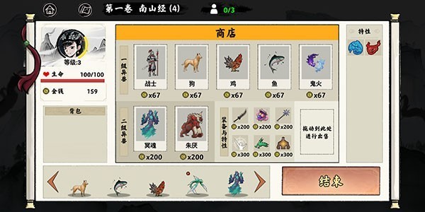 玩家可以在这里购买一级、二级的异兽,还能将不需要的装备和异兽进行售卖获得金币,还可以购买装备和特性。