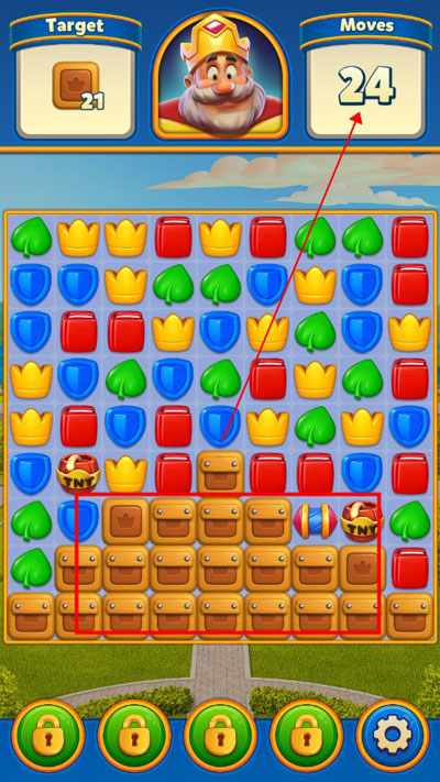 3、相同颜色的物品组合在一起可以消灭掉锁起来的箱子,但是一定要注意剩余的步数,步数用完没能消灭所有箱子即为通关失败