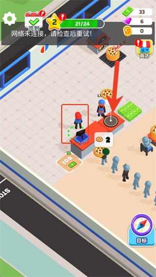 1、游戏中我们需要经营一家披萨店,通过滑动屏幕移动控制小人触碰场景中的各个区域互动,收集足够多的钱踩在地面特殊方块上解锁跟多场景。
