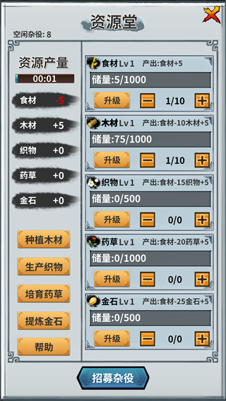 通过招募杂役来生产各种资源的地方。分别通过江湖地图探索杀怪占领各种资源点作坊,增加资源生产的上限。调整杂役来生产需要的资源。主要为炼丹房和铸造坊提供各种基础材料。
