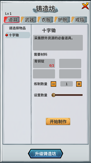 制作各种特殊道具,和弟子装备的作坊。材料有资源堂生产提供。等级越高能制作的装备等级和极品几率越高。