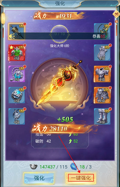 3、穿戴后的装备玩家可以对其进行强化提升,提升装备强化等级,增加战力。