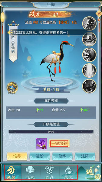 5、游戏内还有坐骑、道友、法身、灵宠可以解锁和培养,大幅提高队伍战力。