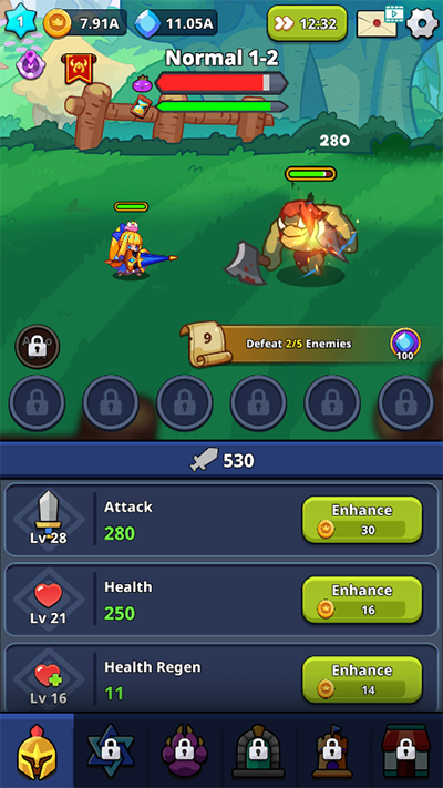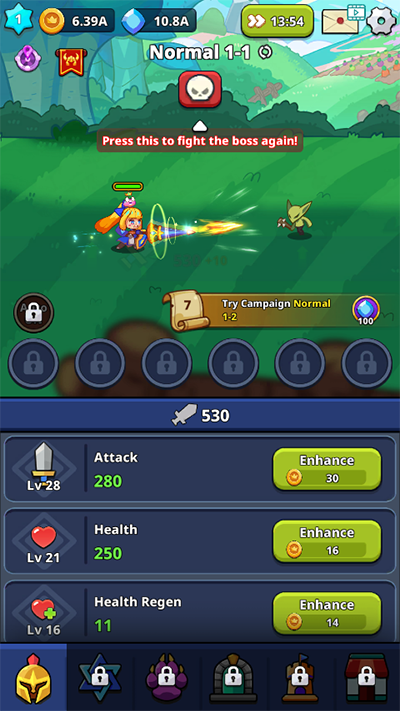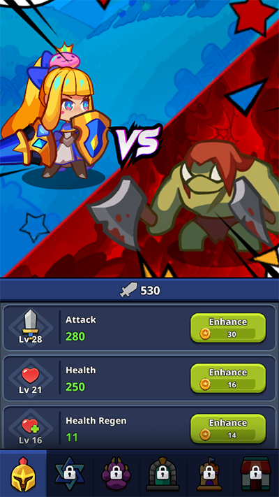 1、游戏支持自动挂机,无需手动操作,只需点击绿色按钮消耗金币提升攻击力,即可轻松击败各类怪物。