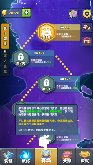 1、进入关卡:从主界面点击「赛场」,根据提示先挑战主线关卡获取装备,装备佩戴齐全后可参与玩家竞技。
