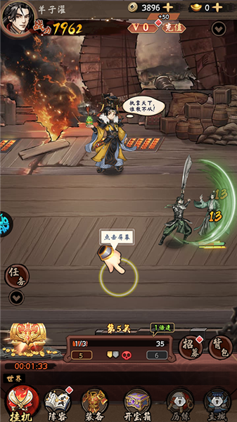 3、游戏内战斗不仅是武将的回合制攻击,还可以点击屏幕自己攻击;