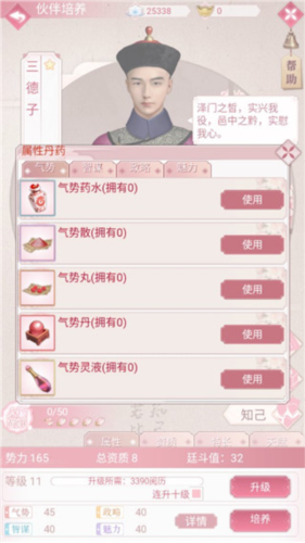 最好培养该小伙伴最突出的属性,比如直郡王培养气势,皇太子培养政略,而四星伙伴拥有两个突出属性则都可以培养.
