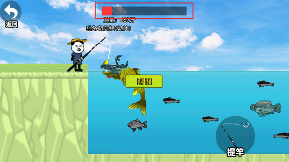 5、不断的点击屏幕右下角的【提竿】按钮,以使得小鱼能够被提起来,当上方的红色进度条掉完之时,即意味着成功;