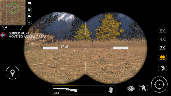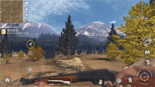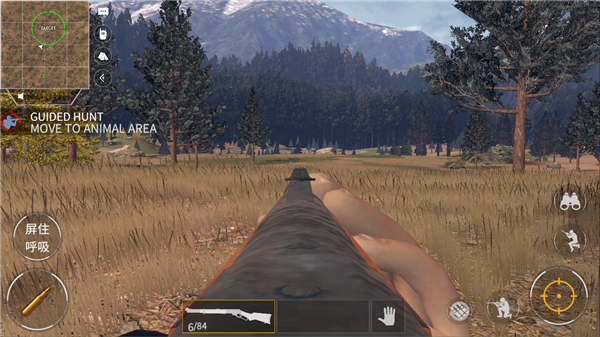 4、当看到有动物出现的时候就屏住呼吸,点击左下角的子弹即可进行射击,如果射中则可以前往拾取猎物。