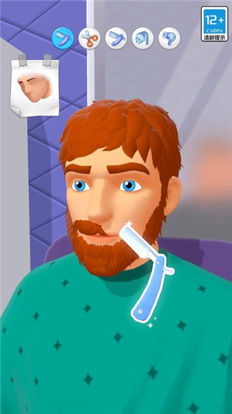 1、主界面点“点击开始”,进入为顾客理发的操作场景。